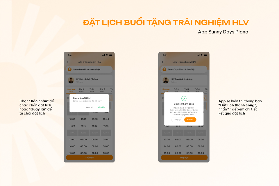 - Bước 5: Ứng dụng sẽ hiển thị thông báo xác nhận, bạn hãy chọn “Xác nhận” để chắc chắn đặt lịch thành công, nhấn “Quay lại” để từ chối đặt lịch. Khi đã đặt lịch thành công, app Sunny Days Piano sẽ hiển thị thông báo “Đặt lịch thành công”.