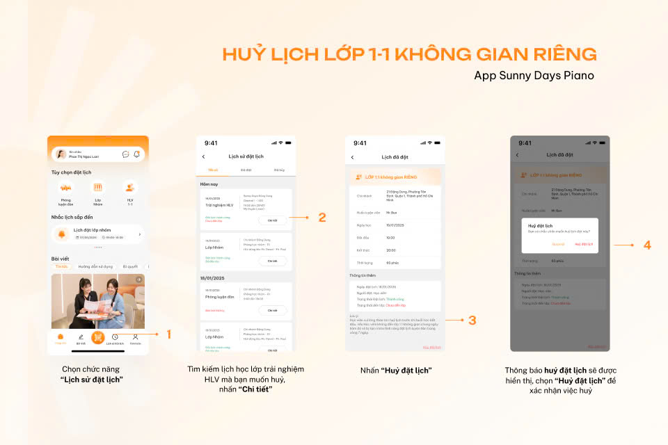Cách huỷ lịch đặt lịch học lớp Trải nghiệm HLV app Sunny Days Piano